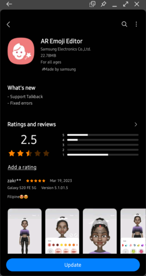 The latest AR Emoji Editor version is available through the Galaxy Store. You can use the link to access it, or if you already have the app installed on your Samsung mobile device, you can open the Galaxy Store app and tap the “Menu” button followed by “Updates” to see if the latest version is waiting for you.