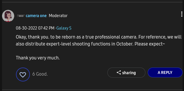 According to the recent posts by Samsung's Expert RAW moderator, the development team is also working on new expert-level shooting functions. What they'll bring to the table is unclear, but Samsung aims to release these unspecified Expert RAW advanced features in October.