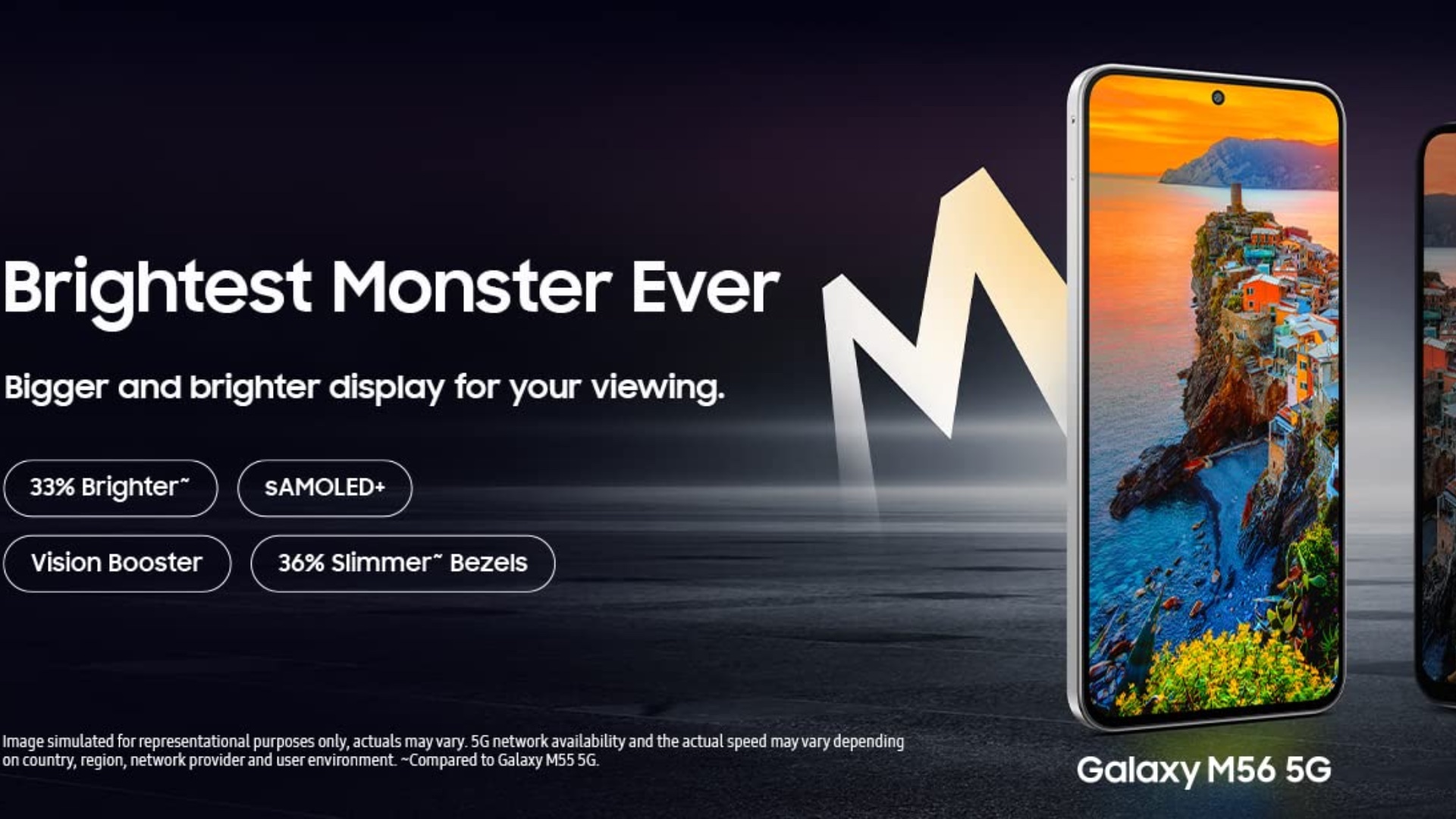 The upcoming phone also features improved durability, featuring Gorilla Glass Victus+, which is claimed to be 4x stronger than last year's phone. Samsung also claims the Galaxy M56 can survive falls from a height of up to 2 meters. Its Super AMOLED+ screen is 33% brighter and has 36% slimmer bezels. It also features Vision Booster.