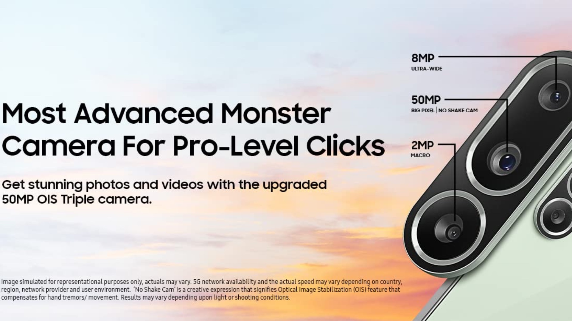 It features a 50MP primary rear camera with big pixels, an 8MP ultrawide camera, and a 2MP macro camera. On the front, thephone has a 12MP selfie camera, similar to Samsung's flagship phones. Samsung says its new cameras can capture images and videos with less noise, thanks to big pixels and AI ISP. It also has 2x zoom portraits.