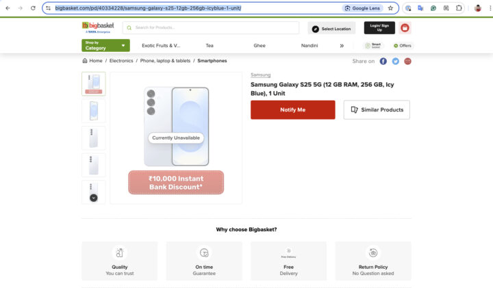 One of India’s biggest online grocery ordering platforms, BigBasket has started showing posters in its app about delivering Galaxy S25 series smartphones within 10 minutes in select places around the country. We couldn’t find it at our location in Hyderabad, Telangana. However, we did come across the listings of the phones on its website.