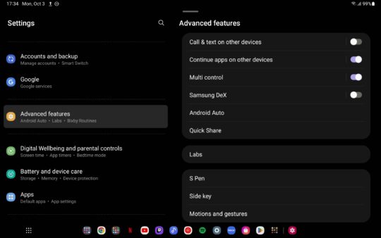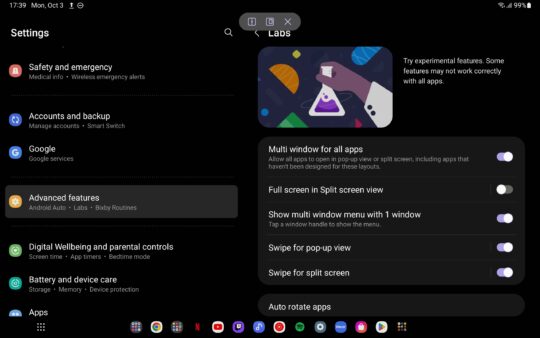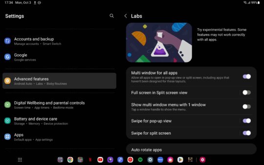 A more effective method for launching apps in split-screen view is to use the taskbar. But if that's not an option, there's also a new “Swipe for split screen” gesture available in Labs, which cuts down on a few unnecessary steps and makes Multi-Window a whole lot easier to reach. To enable this feature, open the Settings app, access “Advanced features,” then tap “Labs” and turn ON the “Swipe for split screen” toggle.