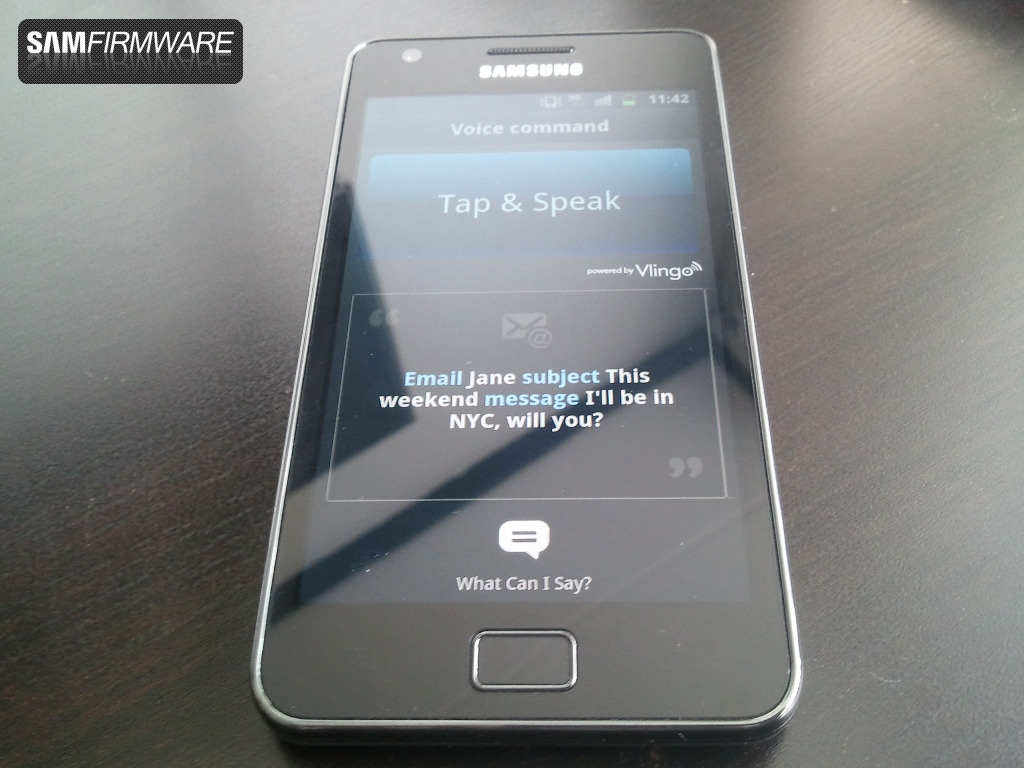 A other nice feature is Voice Talk, this function is nice when you drive in your car or have cold hands( remember the commercial?). This function can be started by pressing on the Voice Talk icon . Well that is the start of it, the next thing is really funny. You are going to talk to your Galaxy by saying : “Hi Galaxy”. Then you phone responds by saying: “What would you like to do”. Now you can say :”Send text to … or Navigate to… or Play music.There are other features to like save a memo or checking your schedule. This feature is powered by Vlingo so for English talking people only. We from Samfirmware love this feature.