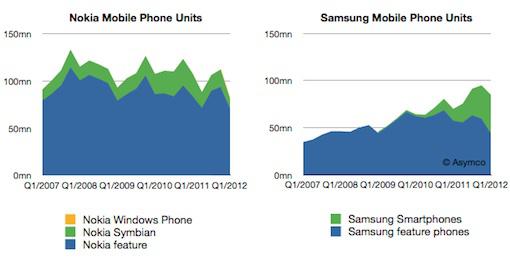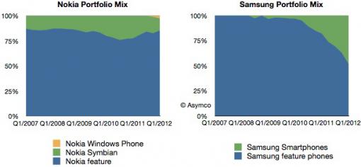 The first chart below shows why. The relationship between smart and feature phones at Samsung is almost 50-50, while Nokia's device sales now consist more than 80% of feature phones (cheap, often loss-making devices). The shift of this ratio to the level of Samsung (and it is undoubtedly) THE spearhead for the next few months (and years) or it will never be okay with the Finns.