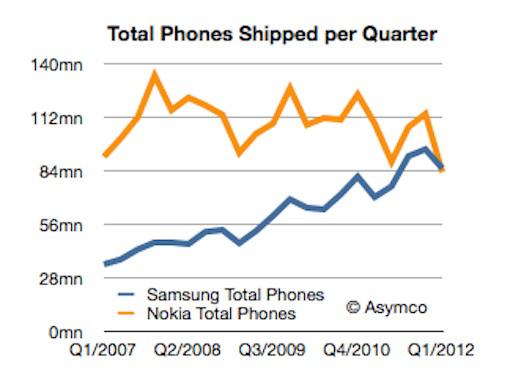 Samsung's sales grew by contrast, compared to Q1 in 2011, with 15 to 20 million devices, depending on which prediction (85 – 90 million) comes out. The Korean manufacturer has yet to present its quarterly results. The same goes for the final results of Nokia for the first quarter of 2012. Anyway, Samsung has overtaken Nokia . Now wait and see whether the Koreans will eat Nokia 😉