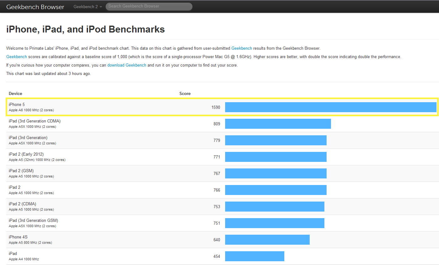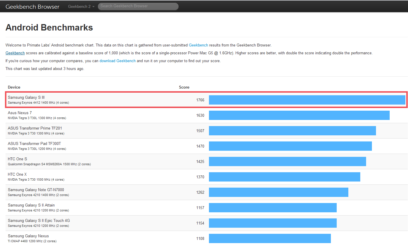 The iPhone 5 packs a Dual-Core Apple A6 Chip clocked at 1GHz whereas the Samsung Galaxy S III packs a Quad-Core Exynos 4412 Chip clocked at 1.4GHz. On the official Geekbench website the scores are a little different then the ones reported by CNET, The iPhone 5 scores 1590 and the Samsung Galaxy S III scores a whooping 1766.