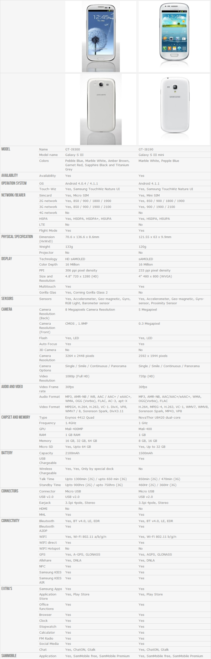 Also we compared the specification directly with those of the Galaxy S III. Please take it into account that the Galaxy S III mini 150 euros cheaper than the Galaxy S III itself.