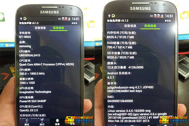 The images reveal that the device features a 5″ Full HD AMOLED display, an Exynos Octa 5410 CPU, PowerVR SGX 544MP GPU and 2GB of RAM. The device is also running Android 4.2.1 Jelly Bean. It looks like the sides of the device are made out of aluminium, as we reported earlier, and the back is made from a plastic material.