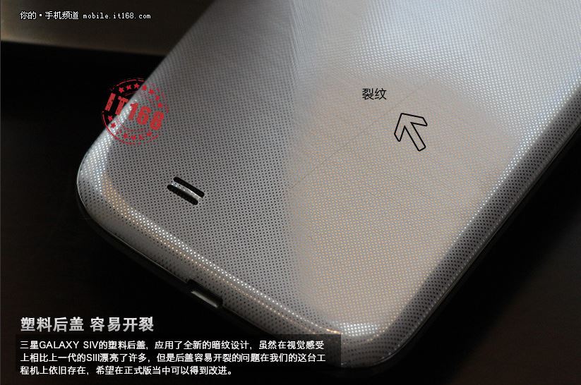 8/19: The plastic back cover uses new design, which is much pretty than SIII. They hope the final version will not cracked easily.