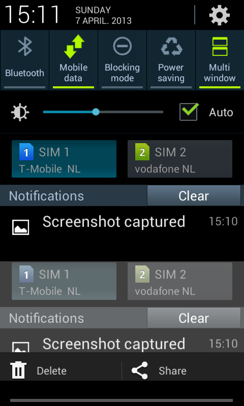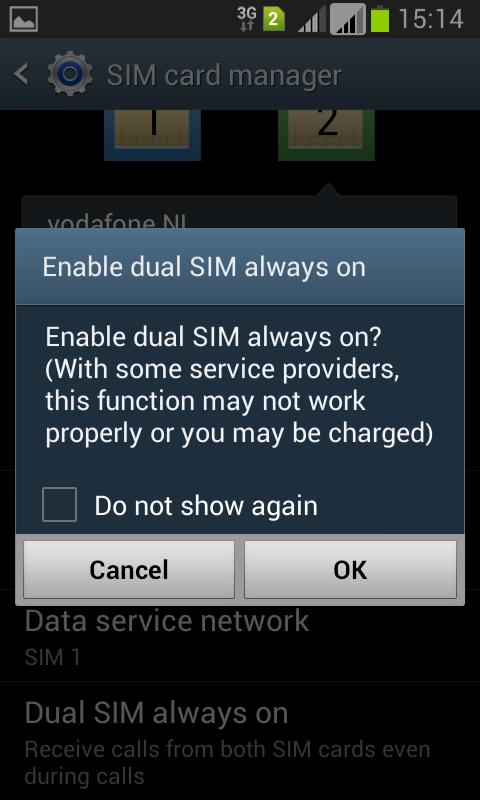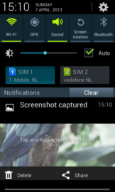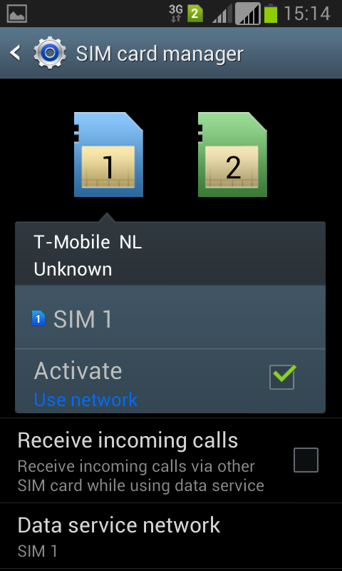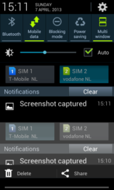 Because we’re testing the Galaxy Grand DUOS variant in this review, we’re also testing it with two sim cards inserted. When changing between the sim cards is done, the background of the device also changes to make it clear that the sim has changed. This feature can also be found in the older Galaxy S DUOS device. Samsung has also made a settings menu to manage the dual-sim settings. This way the end user can choose which sim to use for the internet connection and which sim to use to make phone calls. It is also possible to temporary disable a sim card or enable both of them at the same time.
