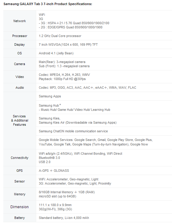 • Enhanced User Experience: The GALAXY Tab 3 7-inch is equipped to better capture life’s moments in stunning clarity and resolution with its 3-megapixel camera rear camera and 1.3 -megapixel front camera. Combined with the latest Android 4.1 (Jelly Bean), it allows users to share photos, videos, and life’s special moments through a few quick taps and swipes.