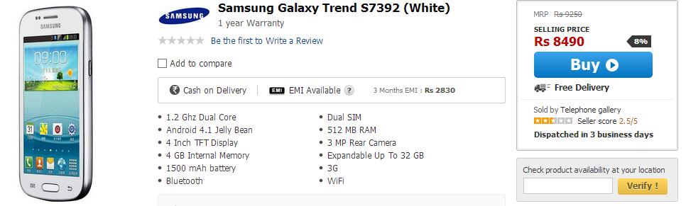 At the aforementioned price, the Galaxy Trend is the cheapest Samsung handset in India with a 4-inch WVGA (480 x 800) screen and a dual-core processor (a low-end Cortex-A5 chipset, nothing fancy). Other features include a 3-megapixel rear camera, 4GB internal memory expandable via microSD card, 512MB RAM, dual SIM slots, a 1,500mAh battery, and Android 4.1 Jelly Bean.