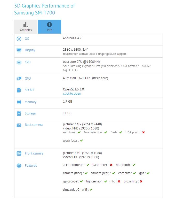 Samsung seems to be preparing multiple upcoming tablets with AMOLED displays. We exclusively confirmed details of one of the AMOLED tablets, the SM-T80x, and now a Samsung tablet with model number SM-T700 has surfaced, hinting at the fact that the AMOLED tablet will come in different screen sizes. The SM-T700 specs are pretty much the same as the Galaxy TabPRO 8.4, including the 8.4-inch display of 2560×1600 resolution, according to its listing at GFXBench – reports have suggested Samsung is working on both 8 and 10-inch AMOLED tablets, so it could be that the SM-T80x is the 10.1-inch version while the SM-T700 is sold as the smaller-sized model in the new AMOLED tablet lineup.