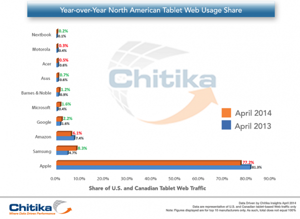 Samsung has made a lot about its ongoing attempts to focus more on the tablet market, and it looks like the company could be making some headway in that regard. According to Chitika, web usage on Samsung's tablets in the US doubled in the one-year period since April 2013, rising from 4.7 percent to 8.3 percent. Compared to Apple, which holds 77.2 perncet of tablet web usage with its iPads, that figure is quite puny, but it's still a major jump compared to the others. Chitika attributes the rise to the launch of new Samsung tablets in the last quarter, and with devices like the Galaxy Tab4 and Galaxy NotePRO for AT&T arriving in the coming months, the usage share should continue to climb steadily.