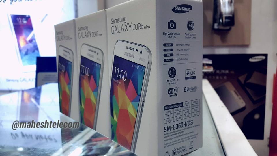 The Galaxy Core Prime (SM-G360H), which broke cover last month on the Indian e-retail store Flipkart, will be launched in India soon. An image of the official packaging of the Galaxy Core Prime has surfaced on the Internet confirming the leaked specifications and also reveals the official pricing. It features a 4.5-inch WVGA PLS LCD display, a 1.2GHz quad-core Spreadtrum SC8830 processor (or possibly a Snapdragon 410), 1GB RAM, 8GB ROM, a microSD card slot, and a 2,000 mAh battery. It runs Android 4.4 KitKat and features dual-SIM card slot, 3G HSPA+, Wi-Fi b/g/n, Bluetooth v4.0, and GLONASS A-GPS. The device feature will come with an MRP of INR 11,300 ($182) but it will sold at an MOP of INR 9,599 ($155). Another variant of the device (SM-G360P) was approved by the FCC last month.