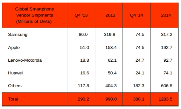 A report by Strategy Analytics shows that Apple's smartphone shipments stood at 51 million in Q4 2014 while in the previous quarter they jumped up to 74.5 million. Samsung too shipped around the same number of smartphones in Q4 2014 but it was down from 86 million units in Q4 2013.