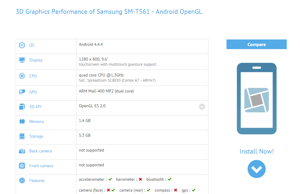A Samsung tablet with model number SM-T561 has shown up on GFXBench, giving us a look at most of its specs. The SM-T561 has a 9.7-inch display with a resolution of 1280×800 pixels, which means we're not looking at a screen with a 4:3 aspect ratio, unlike most of Samsung's upcoming tablets. The tablet is powered by a 1.3GHz quad-core Spreadtrum SC8830 processor, has 1.5GB of RAM, and comes with 8GB of on-board storage. The tablet is running Android 4.4.4 and has no cameras according to the GFXBench listing, suggesting the tablet is in an early stage of development at this time.