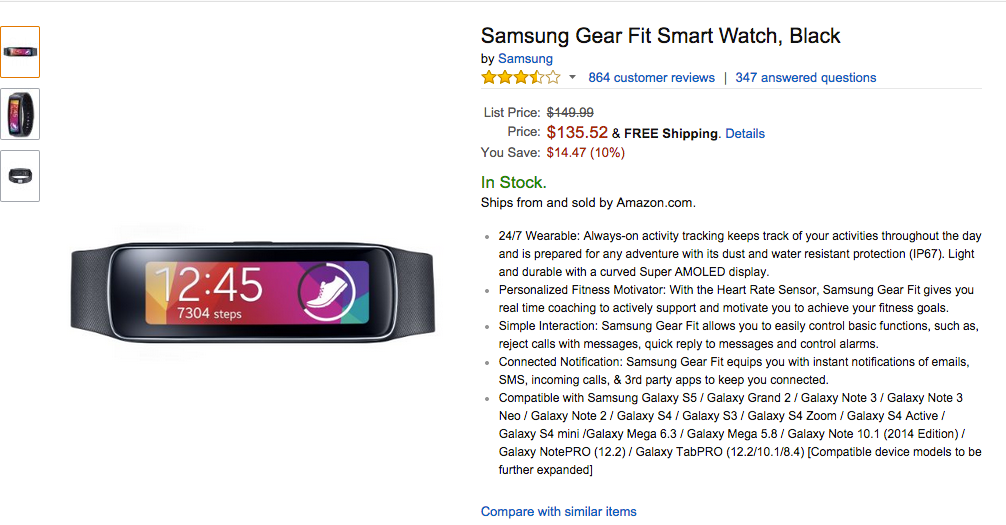 Well, Amazon’s back with a deal for us. What is it? The fitness band that is the standard for smart fitness bands today is at a discount, down from its original price of $199 to $135 – a price drop of $64, a little over 32% of the original price. Amazon promises free shipping for this item (it’s clearly over the $35 free shipping requirement), and the new price is $15 below Amazon’s own list price for the Gear Fit ($149.99), and Amazon's same price fits that of Samsung's