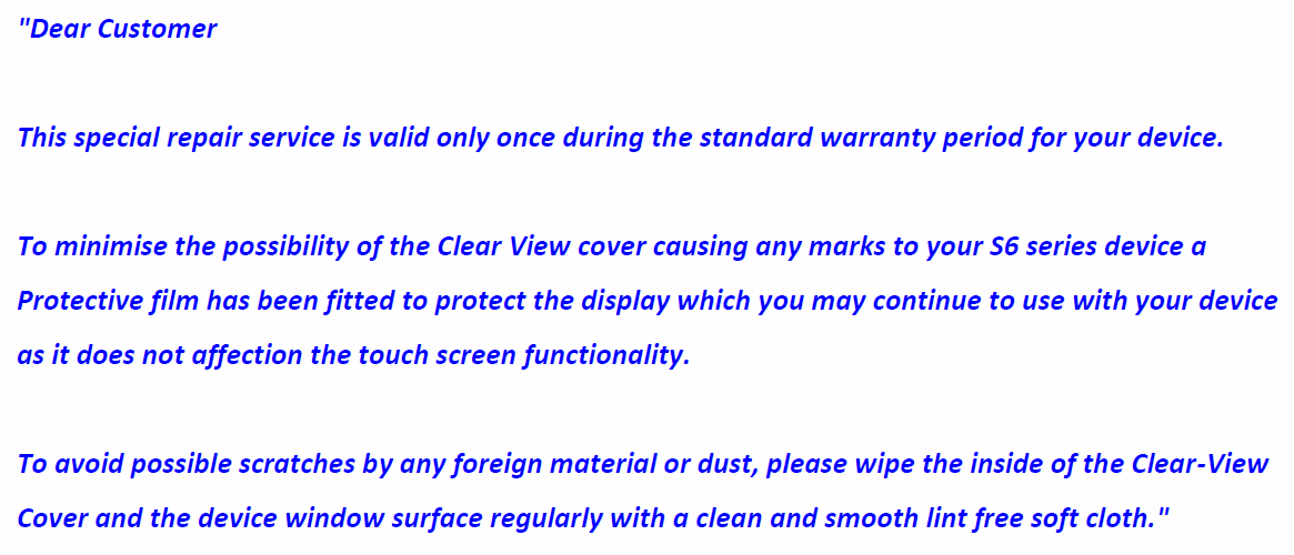 Basically, Samsung is giving affected users a free screen replacement, and is also returning the phone with a protective film on top so that the screen is protected from damage against further use of the Clear View cover. The repair procedure will be initiated once a user has provided the necessary information and once Samsung has confirmed that the scratches have been caused by the cover, and will only cover a one-time free screen replacement.
