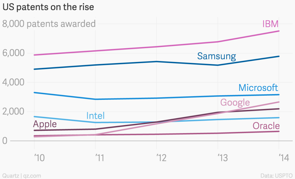 As you can see in the chart below, Samsung, IBM, and Google have increased the pace of filing patent applications. The number of patents awarded continues to rise every year, and the patent office is trying to deal with massive backlog of applications. It is also struggling with patent trolls – companies that neither invent nor manufacture anything, but hold patents just to sue other brands for infringements.