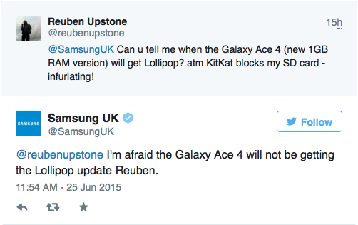 Twitter user Reuben Upstone inquired about Lollipop for his Galaxy Ace 4 (“Can you tell me when the Galaxy Ace 4 will get Lollipop?”), only to receive the following response from Samsung UK: “I’m afraid the Galaxy Ace 4 will not be getting the Lollipop update Reuben.” While it’s not the news anyone wants to hear after having owned a handset for less than a year, it still has to be told. This is even more disappointing, as it seemed as though, two months ago, the Galaxy Ace 4's Lollipop confirmation was affirmed.