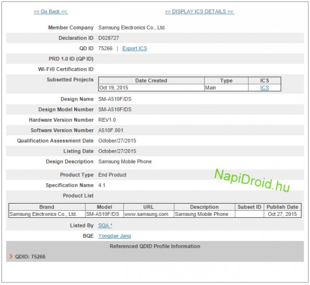 The Bluetooh SIG has certified the SM-A510F only two days ago, but unfortunately we don't get any information on the A5's hardware. A listing on the import tracking site Zauba had mentioned a 5.2-inch display, which is slightly larger than the 5-inch display on the original A5 (the new A3 also has a larger screen than the previous A3, and also a higher display resolution.) Other specs are unknown at this point, but it shouldn't be long before the fog lifts and we get all the juicy details.
