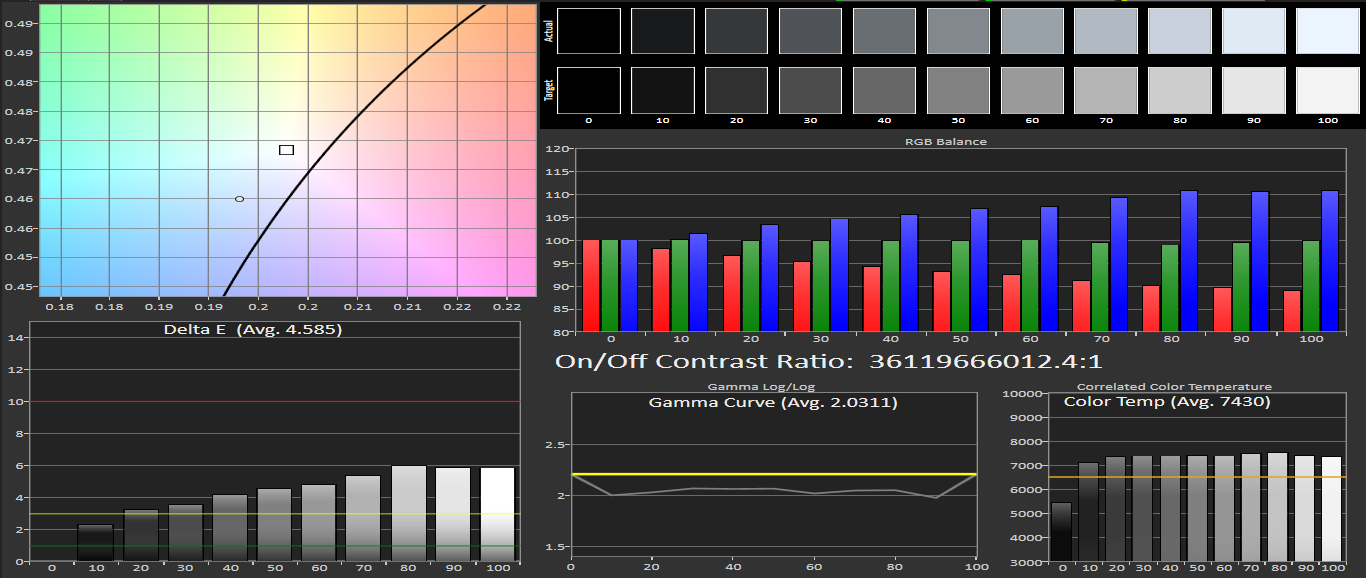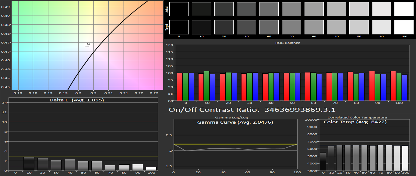 These errors can't be seen with the human eye, with a Delta E error of 1.8 in the Grayscale color error. Basic mode is very good, with contrast ratio being unmeasurable here as well. Its color temperature is almost perfect with 6422 and 6509 being the sweet spot.