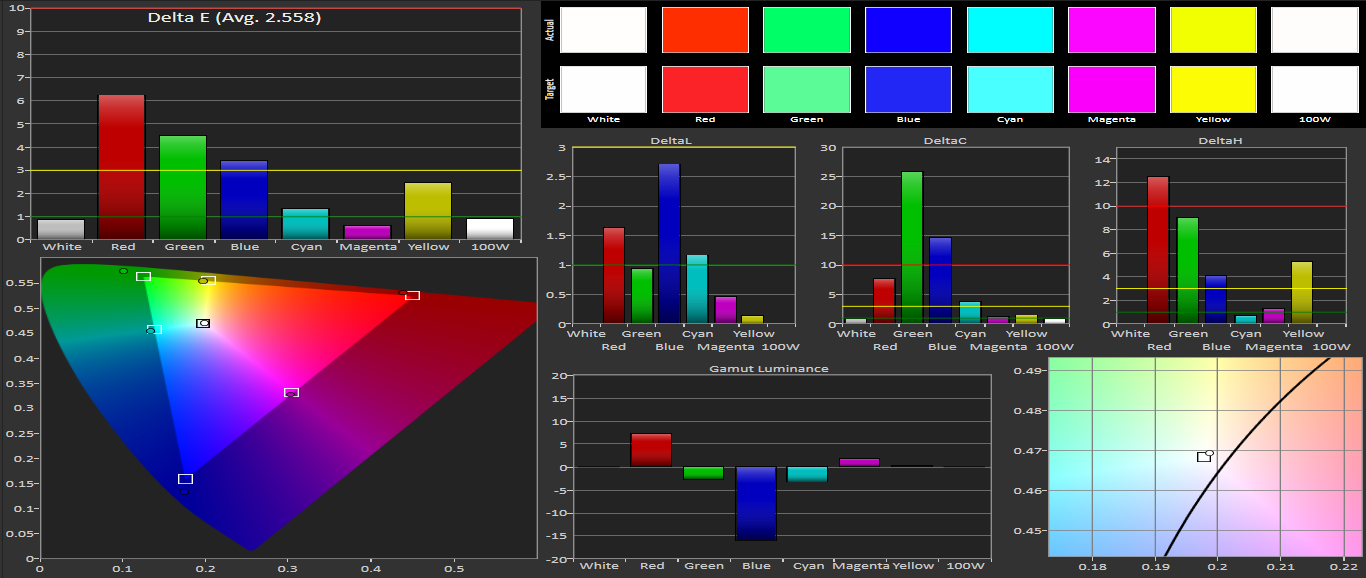 All in all this is a very nice screen with great contrast, and the colors are almost perfect in Basic mode. Adaptive mode is way oversaturated, however, and the other two display modes aren't that great either. Grayscale mode isn't calibrated correctly and it is way too cool.