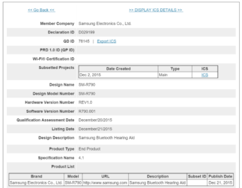 A few weeks ago, Samsung applied for registration of a trademark for the term Earcle in South Korea, with several references to hearing aids in its related products description. Today, a device with model number SM-R790 has surfaced at the Bluetooth Special Interest Group's (SIG) database. The device's description clearly states Samsung Bluetooth Hearing Aid, leaving very little to our imagination.