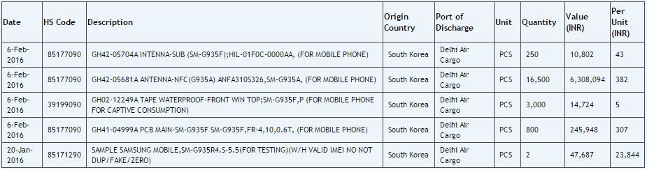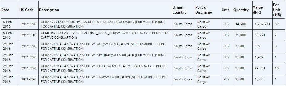 Numerous waterproof components, such as a waterproof mic and SIM tray, are mentioned for the Galaxy S7, and something called a waterproof tape for the Galaxy S7 edge. These were all imported to India at the end of January and around early February for testing, and it's likely these components will be used in the retail units that are expected to go on sale in the first half of March. Of course, do keep in mind that these devices will simply be water-resistant and not fully waterproof, so taking them along with a swim is something that Samsung is not likely to recommend (though they should be water-resistant enough to be used underwater for a photo or two.)