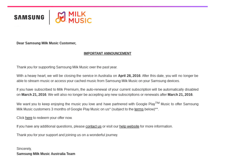 Milk Music subscribers in Australia are being notified of the impending shutdown via email. Milk Music will be shut down in Australia on April 28 after which it won't be possible to stream or play downloaded tracks. Customers who subscribed to the premium version of Milk Music have already had their subscriptions automatically disabled on March 21. Samsung has partnered with Google Play to offer Milk Music customers three months of Google Play Music for free. It's quite likely that Milk Music will meet the same fate in markets other than Australia in the near future.