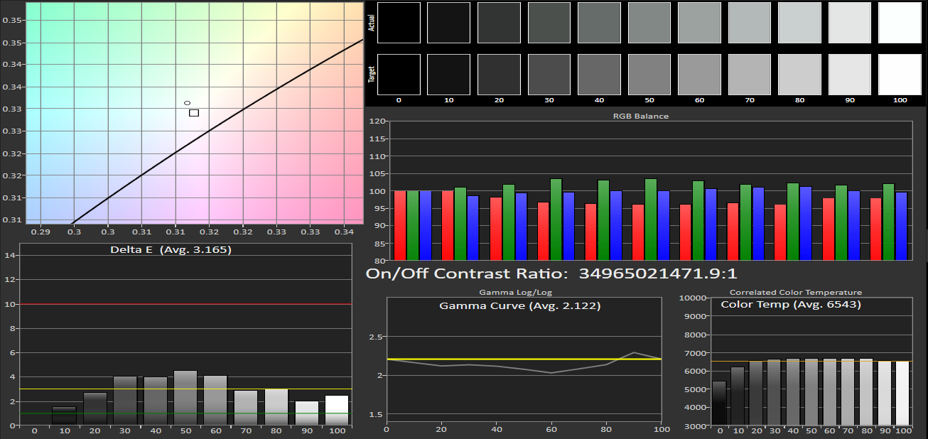 The error of the Grayscale color is not too great at 4.7 and the whites are blueish here as well; that is something manufacturers do to make the whites look more white, especially on AMOLED displays. The contrast ratio, however, is unmeasurable so that is extremely good. Blacks are really black, yet when we get to the lighter colors we see that blueish tint popping out and red is almost completely gone. This is something you can see at the color temperature as well, with a temperature of 7413 being too cold (and 6509 is the sweet spot).