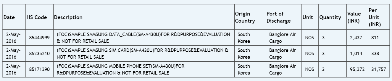 As is so often the case, it is the Indian import database Zauba that spills the beans on a device with model code SM-A430. Following Samsung's conventional naming scheme, this would be the Galaxy A4 undergoing the usual slew of R&D activities. No details about the device itself are listed, though indicated unit value is well into flagship territory.
