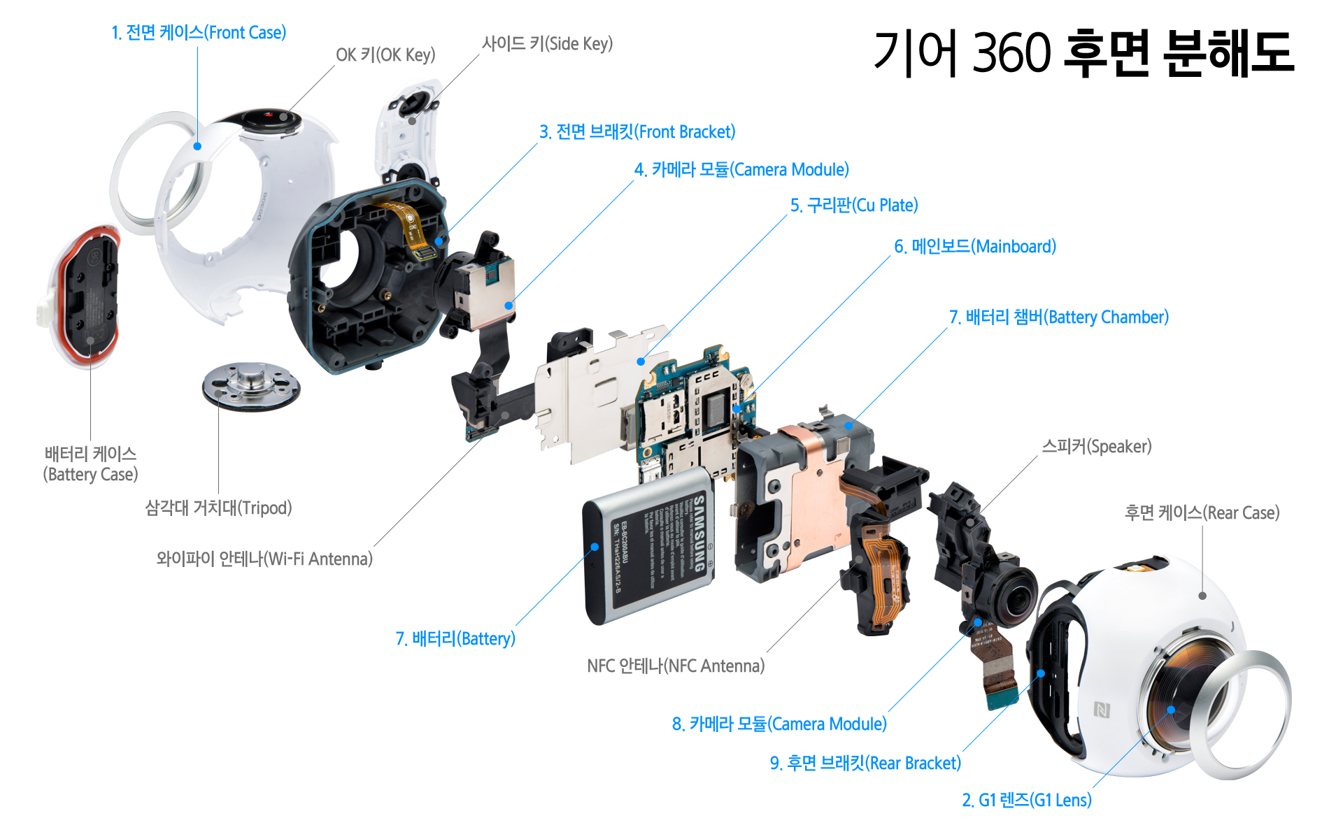 As can be seen in the image below, the Gear 360 is made up of eight main components: A protective casing, a G1 shock-resistant lens cover, a front bracket which holds the display in place, two 15MP Dual CMOS camera modules (front/rear), a copper sheet to cope with the head generated by capturing video, a motherboard, a 1,350mAh battery and a rear bracket which houses the Power and Menu keys.