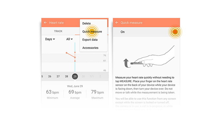 In order to help you get a quicker read of your heart rate, the quick measure feature lets you simply place your finger on the heart rate sensor and place the device face down for the measurements to be taken. Once done, you can simply turn over your device to have a glance at your heart rate and other vital information. This will save users the time of manually having to tap the ‘Measure' button to record the heart rate each time.