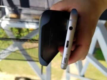 Galaxy S7 edge wireless charging battery pack is light and keeps the phone easy to hold – even with the battery pack on