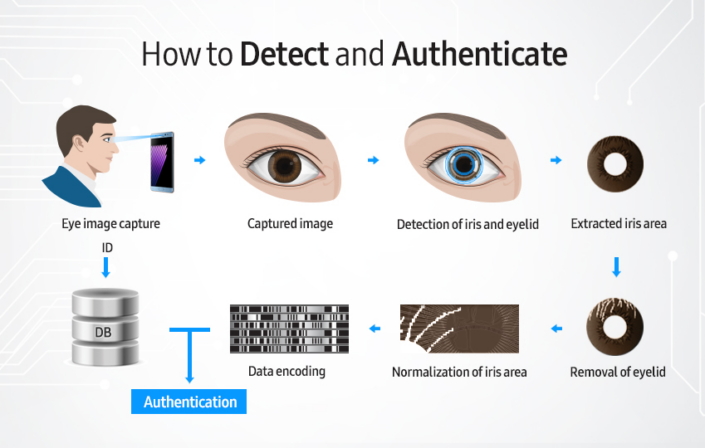 Samsung has published details of just how the iris scanner works, showing a diagram of the human eye, the portion called the iris, as well as how the iris camera detects the iris and eyelid, embeds the iris scan as encrypted code, then accesses it when someone attempts to perform an iris scan to see if the embedded code matches the code of the eye in front of the iris camera. Samsung added the iris camera to capture human irises as well as an IR LED to prevent reflected light from contaminating iris scans in any way.