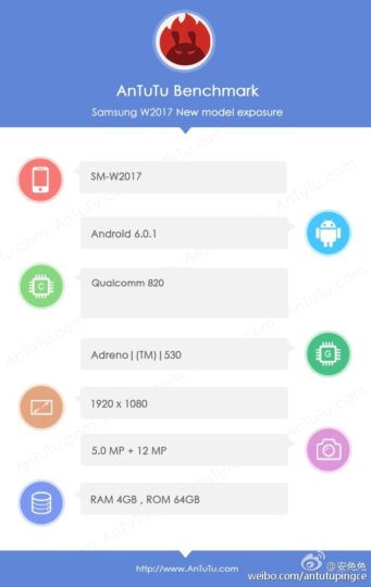 Aside from its 4.2-inch 1920 x 1080 pixel resolution display, the AnTuTu benchmark result shows that it's powered by the Qualcomm Snapdragon 820 processor coupled with 4GB RAM and 64GB of internal storage. It also features a 12-megapixel rear and 5-megapixel front camera. It could be the same camera setup you find in the Galaxy S7 and the Galaxy Note 7. The handset will be powered by Android 6.0.1 Marshmallow. These specs make it clear that the SM-W2017 is certainly going to be a flagship in its own right but given that there's isn't a big enough market for flip phones outside of China, it will most likely be exclusive to the People's Republic.