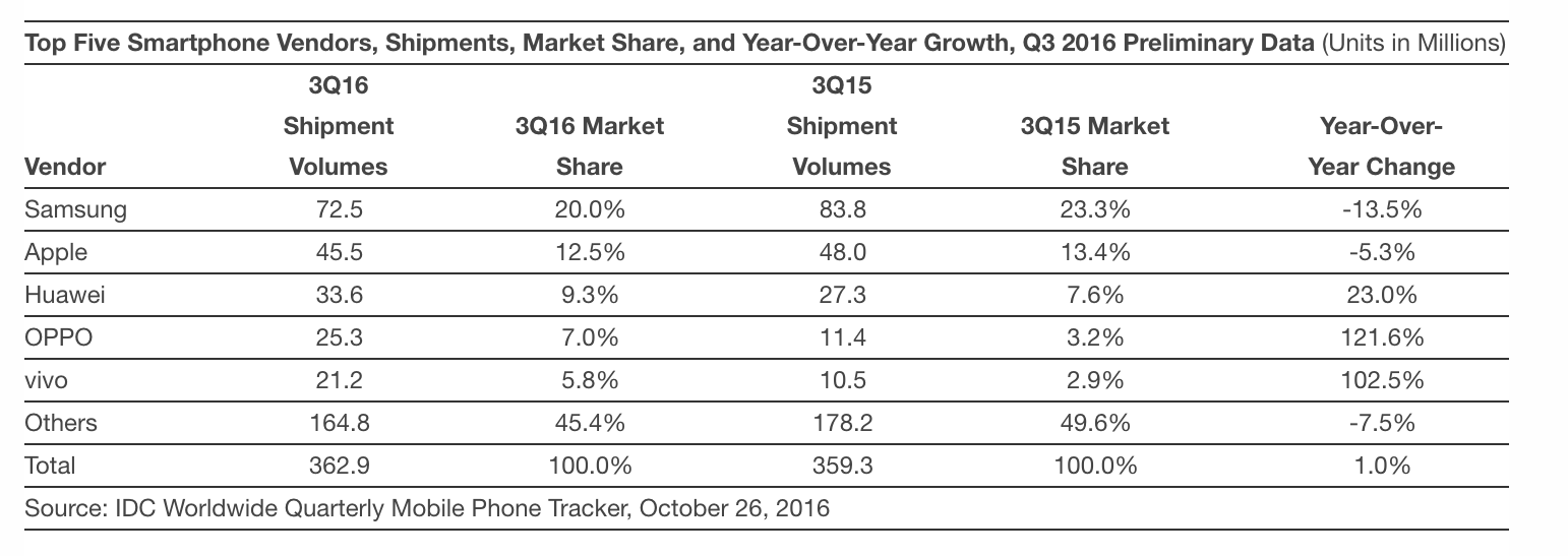 Samsung is still far ahead of its rivals when it comes to unit shipments. Apple retained its second place on the list with shipments of 45.5 million units in the third quarter to clinch 12.5 percent of the market. It's followed by Huawei, Oppo and Vivo in the remaining top 5 places with 9.3 percent, 7.0 percent and 5.8 percent of the market respectively.