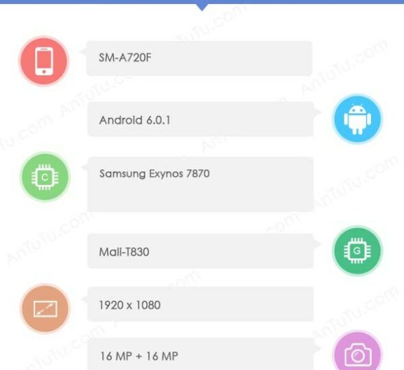 According to the benchmark result, the Galaxy A7 (2017) is going to be powered by Samsung's Exynos 7870 processor with Mali T830 graphics processor coupled with 3GB RAM and 64GB of internal storage. Previous reports have suggested that it's going to have a bonkers 16-megapixel camera on the front, it's actually going to have the same camera on both sides of the device. A 5.5 inch full HD Super AMOLED display is rumored for the Galaxy A7 (2017) as well. It's unclear precisely when Samsung is planning to launch this smartphone but it's quite likely that the Galaxy A7 (2017) will be out early next year.