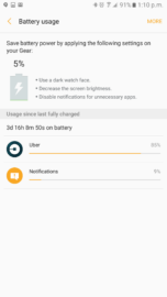 Apart from adding support for the Gear S3, the new update (v2.2.1610) brings the look and feel of the app in-line with that of the Grace UX. The app is now divided into two tabs: Info and Settings. The Info tab now shows current battery level of the connected Gear device. You can also check app-wise battery consumption since last full charge, which makes it easier to find misbehaving apps. In our case, we discovered that the Uber app on our Gear S2 was misbehaving and randomly launching all by itself.