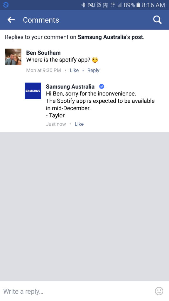 Fortunately, it would appear that neither Samsung or Spotify have abandoned the project. In response to a comment on Facebook, the South Korean company revealed that the application is “expected to be available in mid-December.” It's unclear whether it'll launch in all regions at the same time, but — for what it's worth — we expect it to.