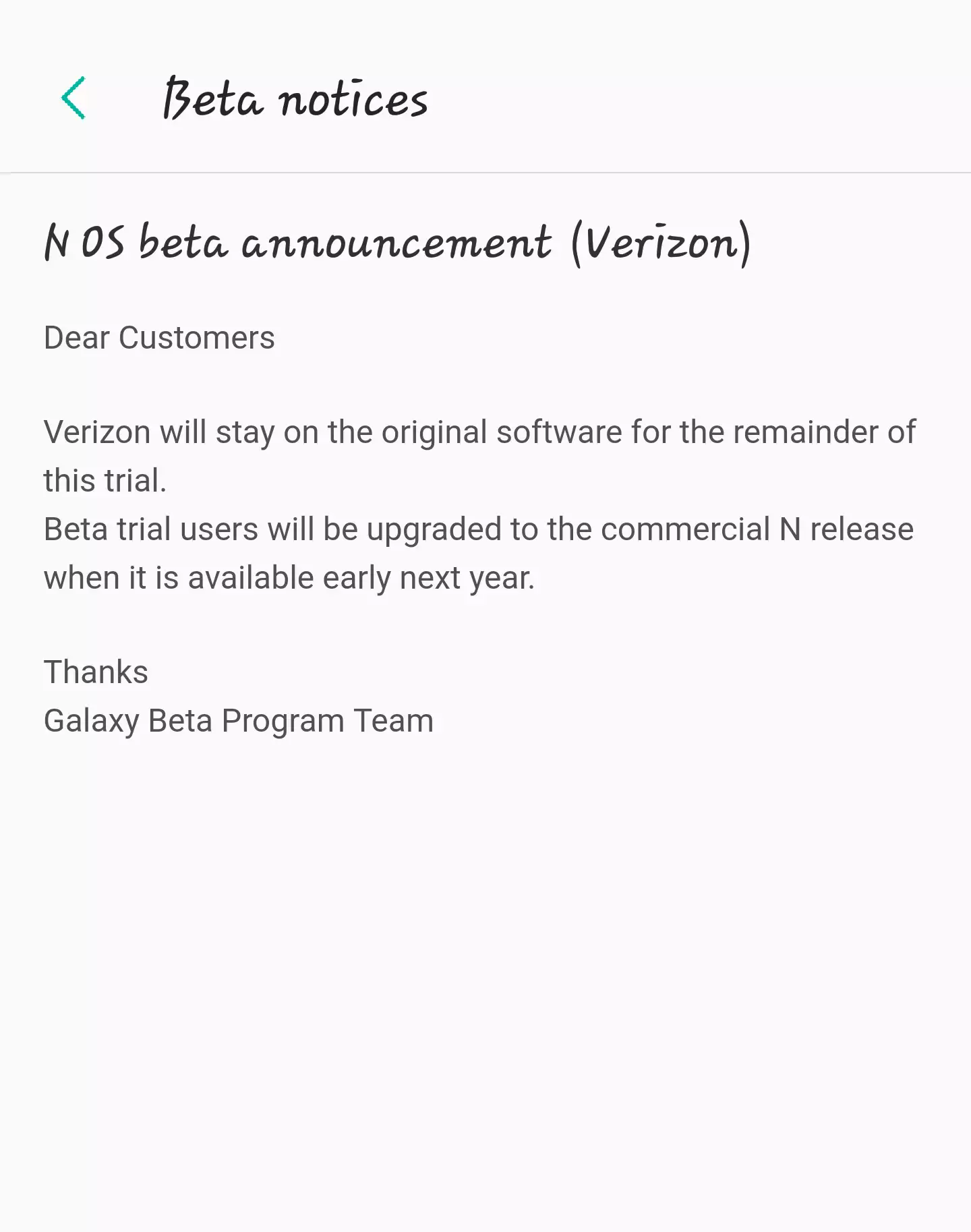 Dear Customers, Verizon will stay on the original software for the remainder of this trial. Beta trial users will be upgraded to the commercial N release when it is available early next year. Thanks, Galaxy Beta Program Team