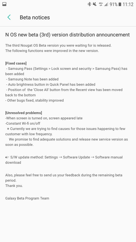 There's still an unresolved problem in these beta builds which causes the screen to appear late when it's turned on. Samsung says that it's trying to find the cause of this issue and will release an updated version of the firmware once it does.