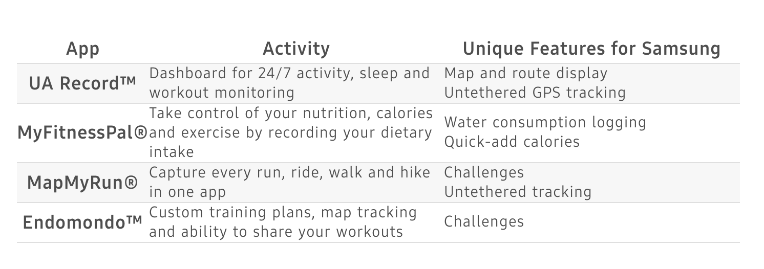 The apps will be available as part of Under Armour Connected Fitness suite including UA Record, MyFitnessPal, Endomondo and MapMyRun. All apps will offer features exclusive to Samsung's wearable devices so users will have an added incentive if they're sticking with Samsung's devices.