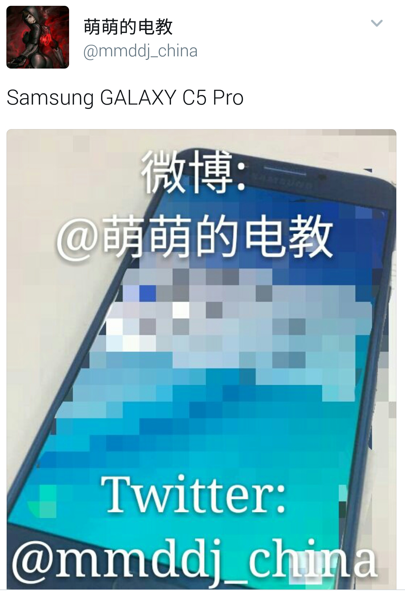 The leak comes to us by way of @mmdj_china, who has now leaked the very first photo of the Galaxy C5 Pro to the public. Similar to the rest of the Galaxy C series, the device will retain its home button and have thin bezels. The traditional “SAMSUNG” branding up top remains. Since the display of the photo is blurry, and while we can make out that blue will be one color offering for the handset (alongside of gold and pink), we can't make out any additional details. The leak has been supported by Twitter member @slashleaks.