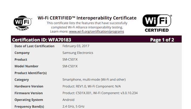 The Galaxy C5 Pro model number SM-C5010 was first spotted at the Wi-Fi Alliance in late December, this was the China-specific variant of the Galaxy C5 Pro. We've now spotted the same handset with model number SM-C501X at the Wi-Fi Alliance. While it doesn't confirm anything right now, it's a big indication that there's a possibility that Samsung might launch this handset in markets outside China at some point in the future.