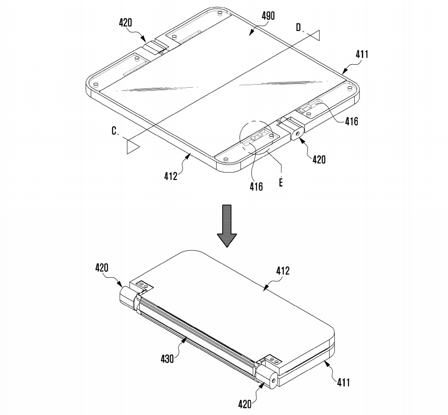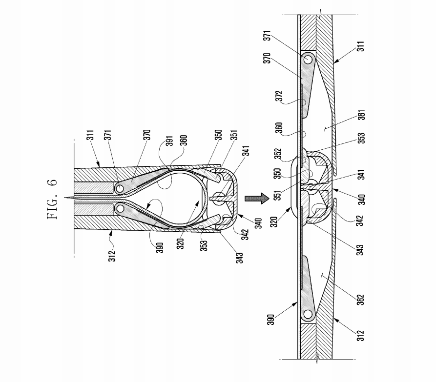 The patent application, which was filed with the US PTO by Samsung on June 9, 2015, under the patent number US 9,557,771 B2, describes a device with a foldable display supported by a mechanical hinge in the middle. As per the patent application, it appears that the screen folds inwards.