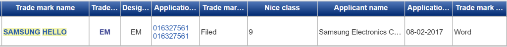 Samsung has filed for this trademark with the European Intellectual Property Office. The filing describes Samsung Hello as “software that enable block users or computers and mobile devices to access, aggregate, organize and interact with content, information and images and topics of general interest to such users.” The filing also mentions that Samsung Hello is an “application software that gives personalized features and information based on user's preferences in the fields of weather, music, entertainment, games, travel, science, health, contact, and social news via voice command and voice recognition.”