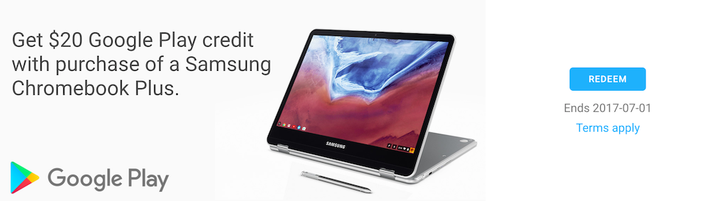 Multiple users have reported that they see a pop up when booting the Samsung Chromebook Plus for the first time, they just have to click on the “Redeem” button to have $20 added to their Play Store account instantly. Those who didn't see the pop up can also take advantage of this offer by heading to Google's “goodies” page from the Chromebook Plus. This offer is valid until July 1, 2017.